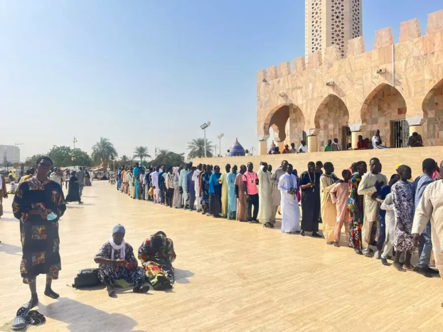 À l’entrée de la grande mosquée de Touba, un long fil de fidèles s’étirent en direction du mausolée de Serigne Fallou Mbacké. Ce site s’est transformé en espace de prière et de recueillement pour les nombreux visiteurs venus commémorer la naissance du deuxième khalife général des mourides.